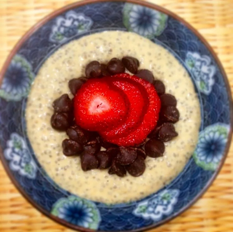 Whisk almond milk, yogurt, salt, vanilla and maple syrup together in a bowl. Microwave peanut butter for 10 seconds and whisk the peanut butter and chia seeds into the bowl, mix well. Place the bowl in the fridge and let sit for a minimum of 2 hours, the longer you let pudding sit in the fridge the more it will thicken. Serve with chocolate chips and strawberry slices. Serves 4 and will keep in the fridge for up to one week.
