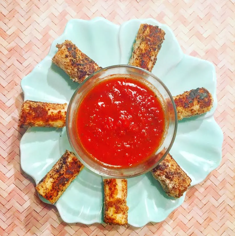 Dinner: Buffalo tempeh "wings" with a ranch dipping sauce